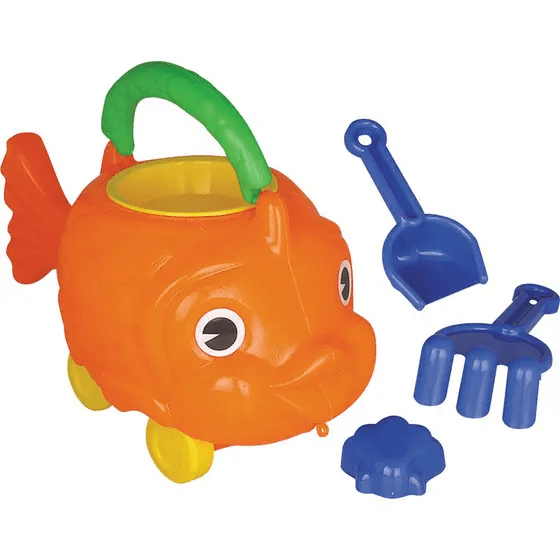 Vamos aproveitar os dias ensolarados. Os papais que gostam de ir à praia com seus pequenos. podem incentivar eles a brincarem na areia usando este belo conjuntinho. Composto de uma divertido peixão. no qual onde os pequenos podem carregar tanto areia quanto água. para montar muitas esculturas. Vem também com peneira. pazinha e ancinho. como também forminha. podendo fazer muitos desenhos na areia. Só não se esqueça de passar o protetor solar.