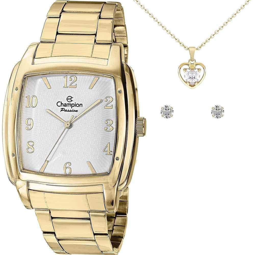 Possui mecanismo Analógico, a pulseira é na cor Dourado, fabricada em Aço, com 23 cm de comprimento e possui Fecho Dobrável com Dois Botões. A Caixa (peça onde fica o mostrador) é fabricada em Metal, possui fundo do tipo Pressão, mede 4,0 cm larg x 3,7 cm alt, sem considerar a coroa, e 1,2 cm de espessura, o que é considerado tamanho Grande para relógios do gênero Feminino. O Kit Relógio Champion Feminino Passion com Colar e Brincos CH24553C tem nível de resistência à água especificado em 3 ATM.