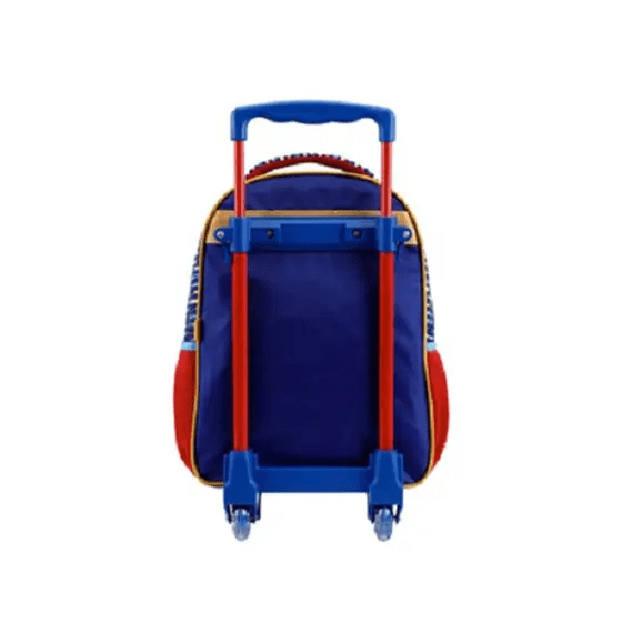 Produzida em poliéster resistente e estampado. Painel frontal em PVC vincado - Compartimento principal amplo e 1 bolso frontal com ziper trator , 2 bolsos laterais mesh, zíper com puxadores personalizados, alça de mão em nyloncom mesh e piping forrado. Carrinho em metal com travas.