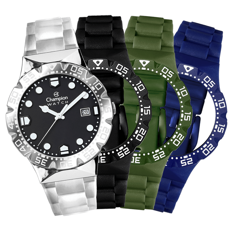 O Champion Troca Pulseiras apresenta uma caixa metálica de 42mm acompanhada por quatro pulseiras de plástico em cores vibrantes, permitindo que você alterne e combine com qualquer roupa ou ocasião. A caixa com acabamento metalizado e o novo mostrador conferem um toque ainda mais sofisticado a esse modelo clássico.