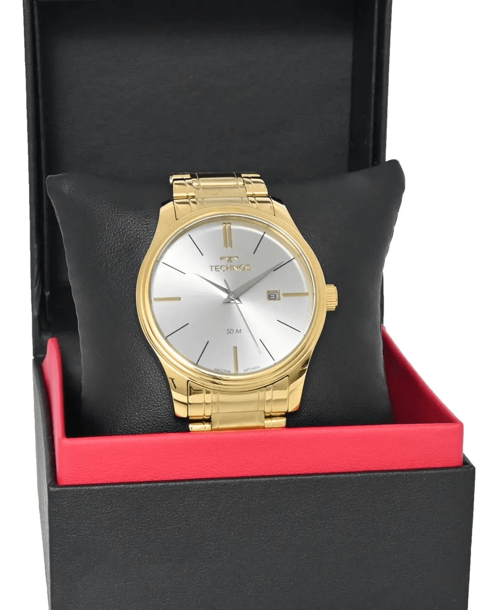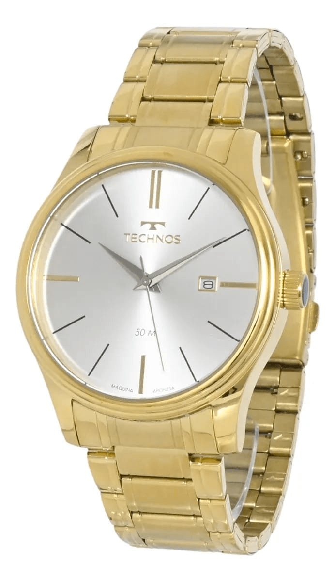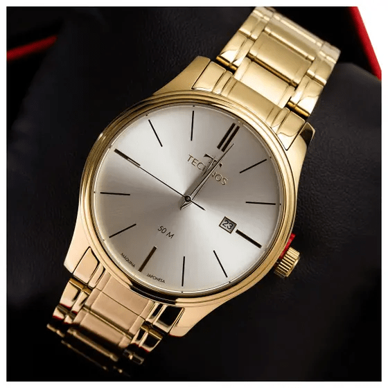 Relógio Technos Steel masculino com caixa e pulseira de aço dourado. O clássico Technos Steel com marcação minimalista no mostrador. Destaque para o design diferenciado da pulseira.