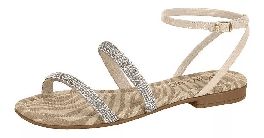 É ideal para você que presa conforto e muito estilo. Composta de material sintético, tiras com detalhes em strass, ajuste fácil por fivela no tornozelo, palmilha super macia, solado flexível, emborrachado com frisos antiderrapantes garantindo segurança na hora de caminhar. Ela é ótima para o uso em momentos do dia a dia, festas, happy hour com as amigas, deixando seus pés na moda atual. Sandália prática e perfeita para compor looks leves e casuais.