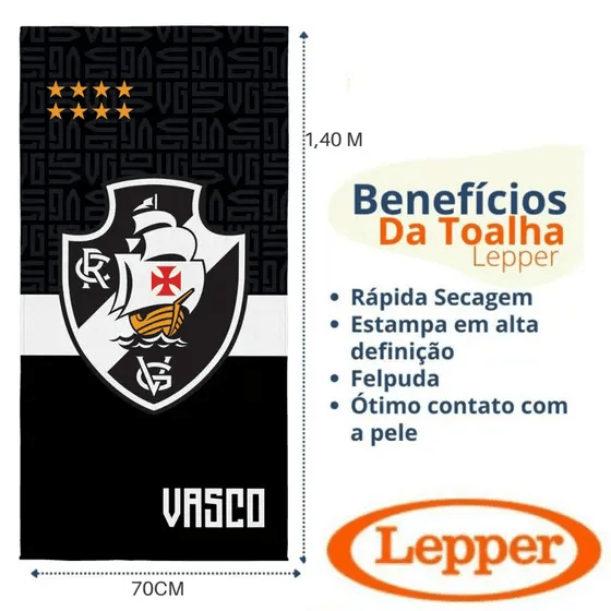 A toalha aveludada do Vasco vem com grande estilo para quem ama esse time de futebol, ilustrando com suas cores clássicas, o escudo do clube. Seu tecido aveludado é super macio, aconchegante e apresenta o verso felpudo para uma absorção ainda melhor. É o Jeito Lepper de tornar os dias de lazer e torcida muito mais especiais e divertidos! 55% Algodão 45% Poliéster .